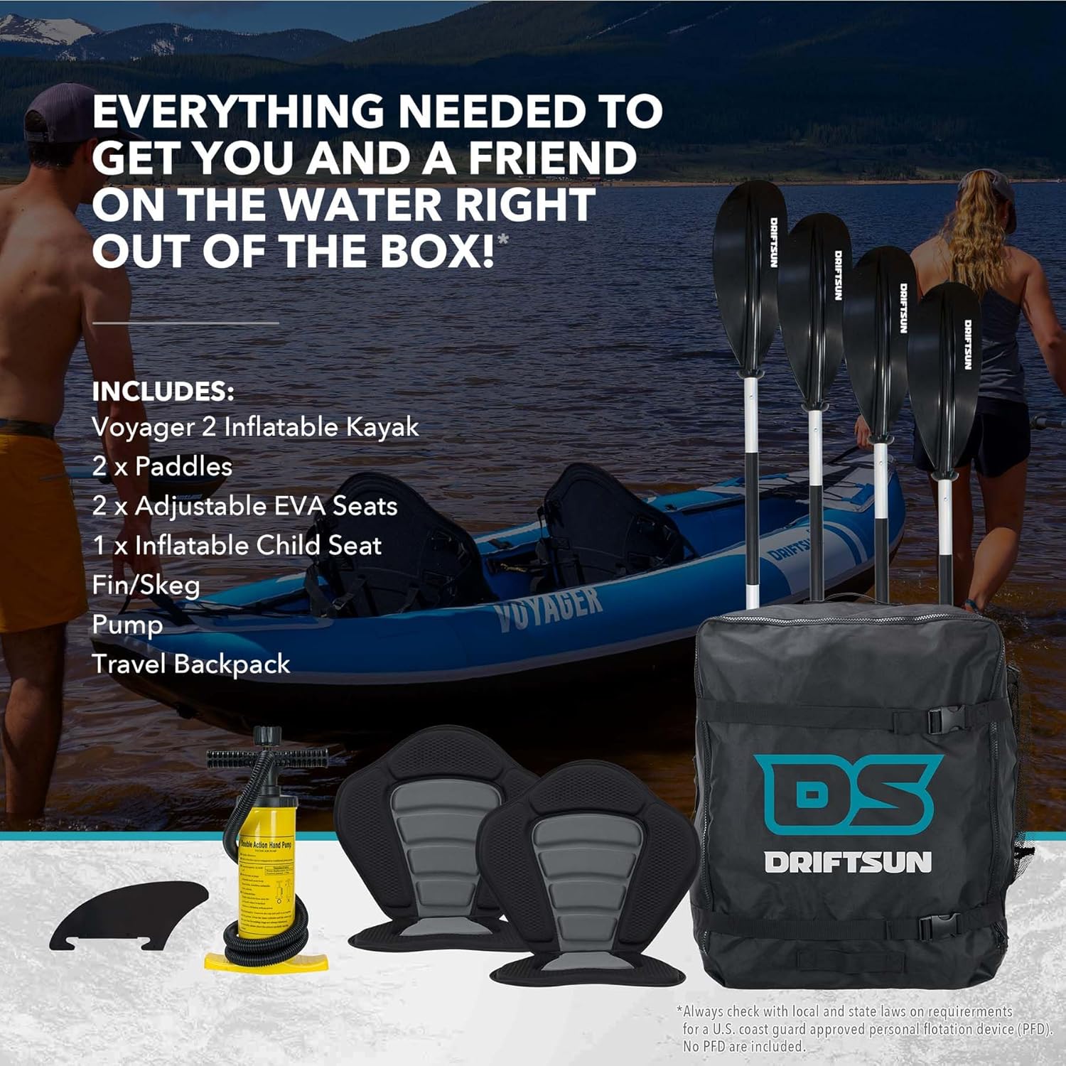 - The Driftsun Voyager Kayak inflates quickly, allowing you to get on the water in no time.