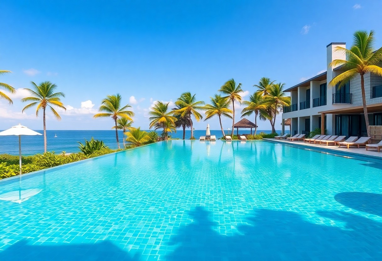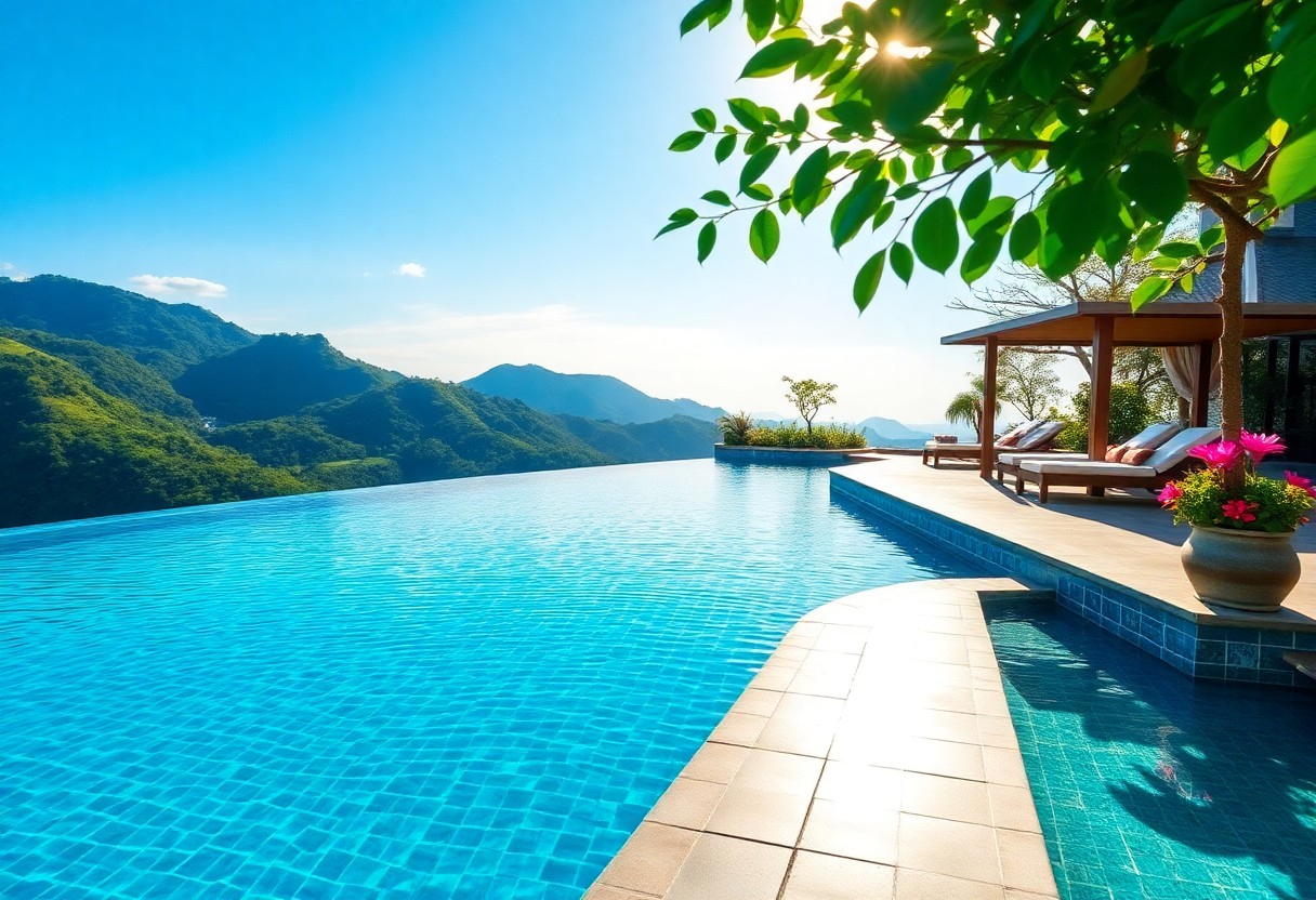 During your swim, you’ll find that the horizon seems to stretch endlessly, merging the azure waters of the pool with the vibrant colors of the ocean beyond. The strategic positioning of the infinity pool enhances your immersion in nature, making it feel as though you’re swimming towards the distant islands. Whether you choose to take a morning dip as the sun rises or enjoy a sunset soak, the changing light adds an enchanting quality to your experience, leaving you with unforgettable memories of peace and beauty.